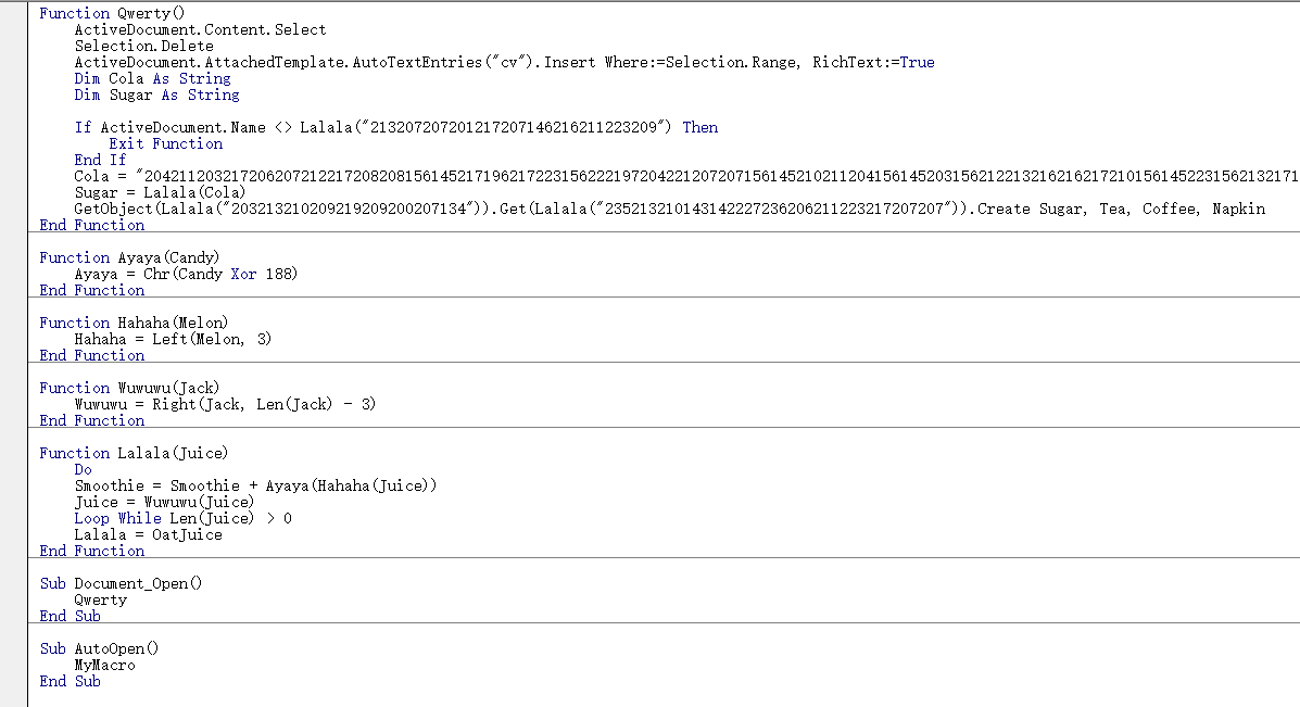 Word有个特性叫自动图文集,即可以把特定内容保存进去,当然也可以在后续把保存的图文集提取出来插入到文档中。这个特定配合特定的macro脚 macro 脚本,可以实现伪加密效果。