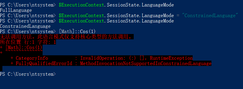 CLM,即约束语言模式,实际上属于 AppLocker,只是针对一些脚本语言的。如果CLM启 CLM 启用的话,一些脚本语言例如Powershell的 Powershell 的使用会被限制,只有白名单里的脚本才不会被影响。CLM带CLM 带来最直接的影响就是限制了对 .NET框架的调用、执行C#代 C# 代码以及反射。我们可以通过Powershell代码 Powershell 命令 $ExecutionContext.SessionState.LanguageMode 来检查语言状态。