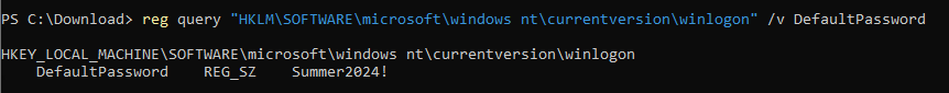 我们可以使用cmd命令 reg query "HKLM\SOFTWARE\Microsoft\Windows NT\Currentversion\Winlogon" /v DefaultPassword 进行查询