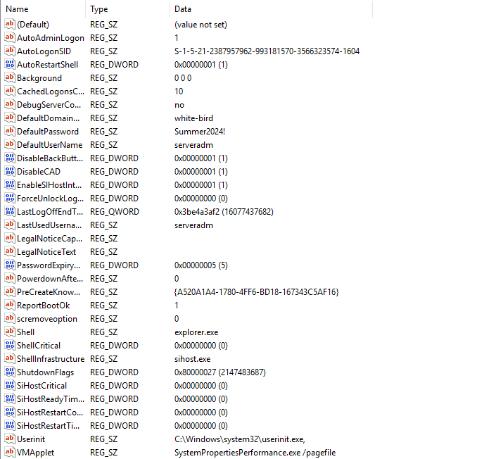 有些主机会设置开机自动登陆,那么明文的帐号密码会存储于注册表 HKLM\SOFTWARE\Microsoft\Windows NT\Currentversion\Winlogon 处