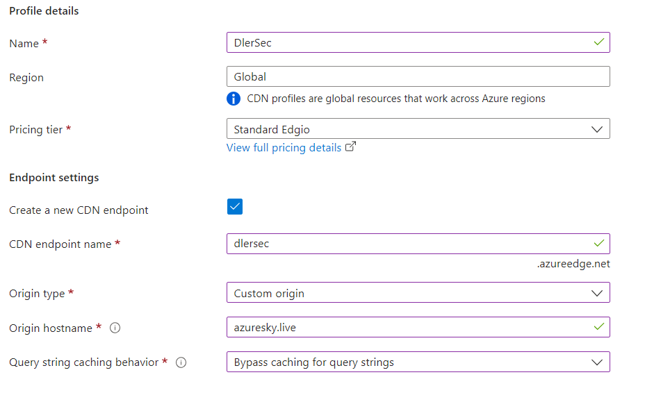 填写相关信息,订阅选择刚刚创建的 pay-as-you-go,以及对应的资源组。CDN 终端名称决定了我们的子域名Origin type 选择 Custom OriginOrigin hostname 填写我们的 C2 服务器域名Query string caching behavior 选择 Bypass caching for query strings