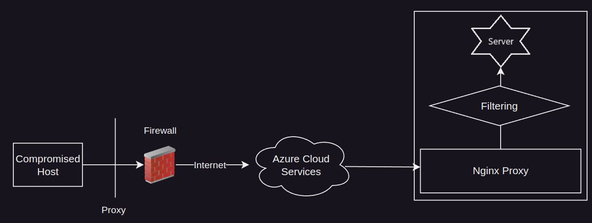 我们的 C2 基础设施结构如下所示,受害主机连接到 Azure 云服务,在本小节是 CDN。Azure 云服务充当着转发器/代理的作用,将收到的 Beacon 通信转发至 C2 服务器对外开放的 Nginx 服务器,Nginx 再将 Beacon 通信转发至不可被外部访问的 C2 监听端口。