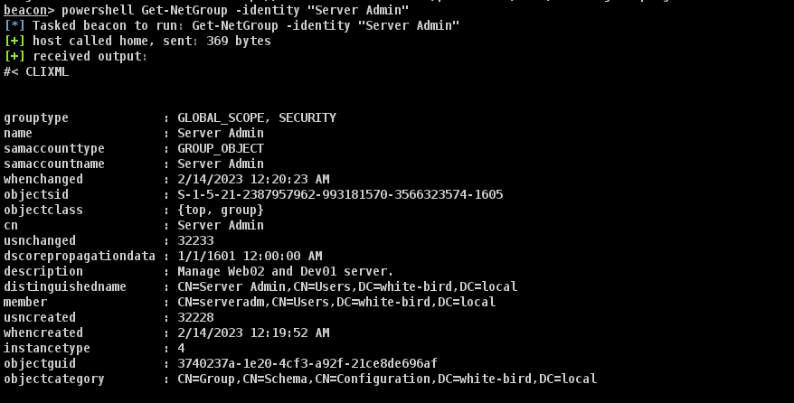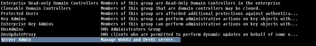查看 Server Admin 群组信息,根据描述得知,该组成员可以管理 Web02 与 Dev01 主机,因此 serveradm 可能对这 2 个主机具有远程访问权限,甚至最高权限 (root 和 Administrator)