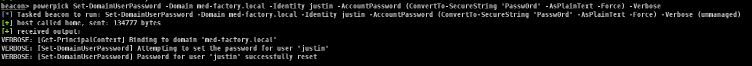 Set-DomainUserPassword -Domain med-factory.local -Identity justin -AccountPassword (ConvertTo-SecureString 'Passw0rd' -AsPlainText -Force) -Verbose