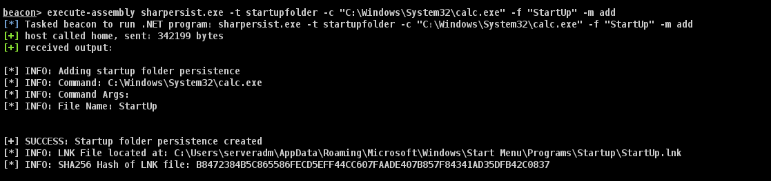我们还可以通过SharPersist工具实现:SharPersist.exe -t startupfolder -c "C:\Windows\System32\calc.exe" -f "StartUp" -m add