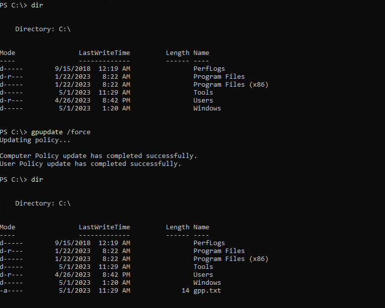 修改成功后,更新组策略。然后发现文件已经从 SMB 目录中被拉取到本地磁盘上了。