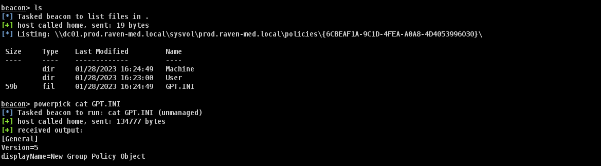 考虑到 SYSVOL 包含所有 GPO 的策略文件,并且任何认证的域用户都可以访问此共享,我们可以检查文件和文件夹以枚举 GPO 信息。 访问UNC路径 \\dc01.prod.raven-med.local\sysvol\prod.raven-med.local\policies,我们可以看到所有GPO的文件夹: