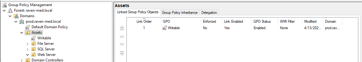 以 PROD 的上下文为例子,GPO Writable 作用于 Assets 这个 OU,默认情况下,Assets 包含的 2 个子 OU 全部会继承该 GPO 的作用。除非该 GPLink 被配置了启用但不强制,且子 OU 选择阻止继承。