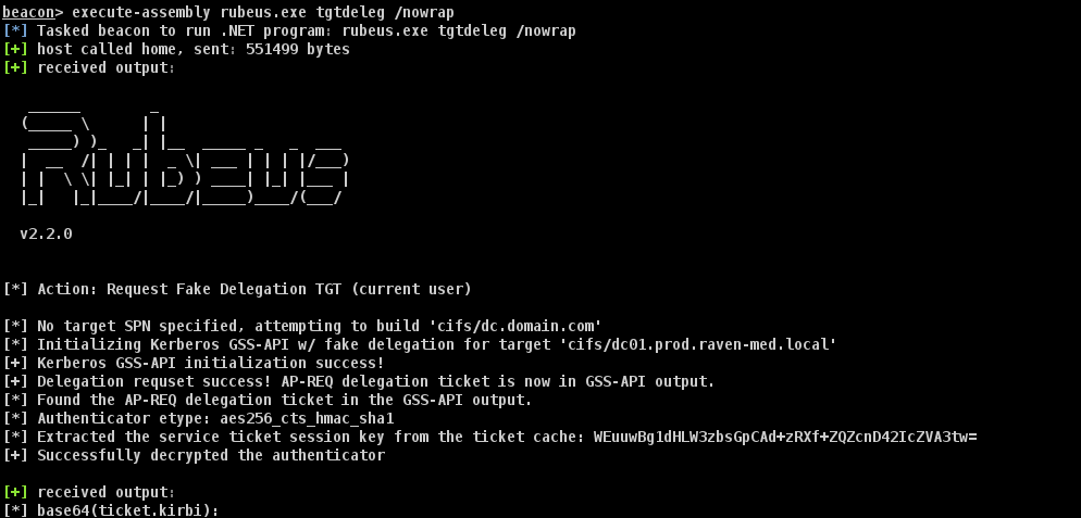 情形 2:2:我们没有本地管理员权限,也不知道当前用户或主机的凭证。这种情形通常是我们拿下了被配置了约束委派的服务账户,但该账户对主机没有本地管理员特权,即无法提取密钥。我们可以使用 Rubeus 的 tgtdeleg 来申请可用的 TGT。