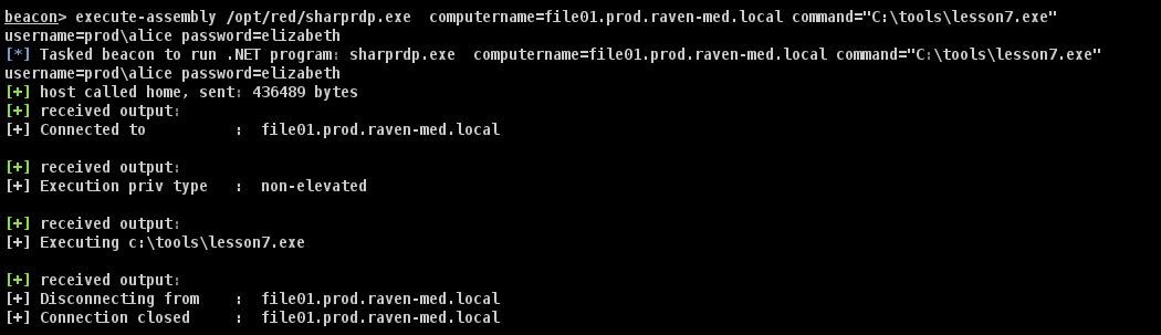 我们知道 file01 有个公开可读可写的 SMB 目录 Tools,我们猜测其绝对路径为 C:\Tools (使用 UNC 路径执行程序可能会被阻止)。上传一个 Beacon,然后使用 SharpRDP (https://github.com/0xthirteen/SharpRDP) 在不开启 GUI 的情况下通过 RDP 协议远程执行该 Beacon。