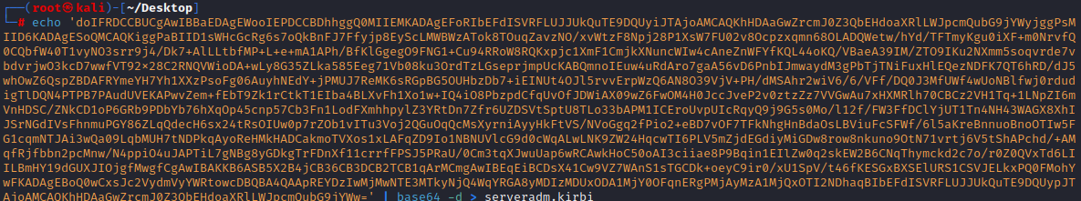 至于将文本保存为 kirbi 文件,在Windows端,我们可以通过如下的 Powershell 命令保存 kirbi 文件。在 Linux 端,我们可以通过命令 echo '<ticket>' | base64 -d > example.kirbi 实现。