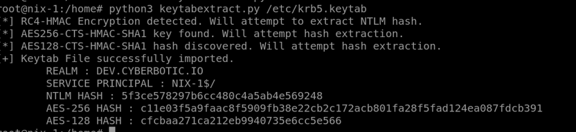 keytab 文件包含 Kerberos 主体名称和凭证,例如NTLM哈希。我们可以使用脚本 (https://github.com/sosdave/KeyTabExtract) 从中提取凭据,提取出了 NTLM 或者 AES256 凭证,那么我们想要获得其他形式的票据自然不是难事。每台 linux 域计算机在 /etc/krb5.keytab 中都有其 keytab 文件,默认情况下可由 root 访问。