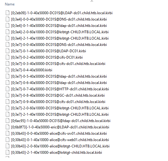 我们通过 mimikatz 或者 rubeus 请求与导出的 TGT 或者 TGS票据格式为 .kirbi。对于 mimikatz,我们可以使用命令 sekurlsa::ticket /export 导出所有票据,格式为 .kirbi。