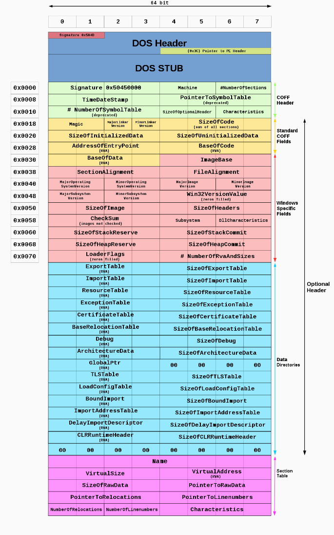 可移植可执行 (PE) 文件格式与 Windows 操作系统上能实现代码执行的文件类型所使用,常见的拓展名有 exe、dll、sys 等。PE 格式描述了文件必须遵循的标准结构,以便定位其内容并在执行的各个阶段使用其信息。了解这种格式对于恶意软件分析人员来说尤为重要,因为检查可执行文件的 PE 内容可以提供有关文件的大量信息,可能包括文件的作用。对于我们开发恶意软件的攻击者也同样重要,因为一些免疫检测的技术需要对 PE 文件十分熟悉。