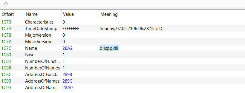 首先,我们需要确定给定 RVA 所在的节。以导出表结构体 Name 成员 (不一定每个 PE 文件都有,以一非托管 DLL 为例) 为例,该成员指向当前模块的名称,即名称字符串的 RVA,我们可以看到 RVA 是 0x28A2。