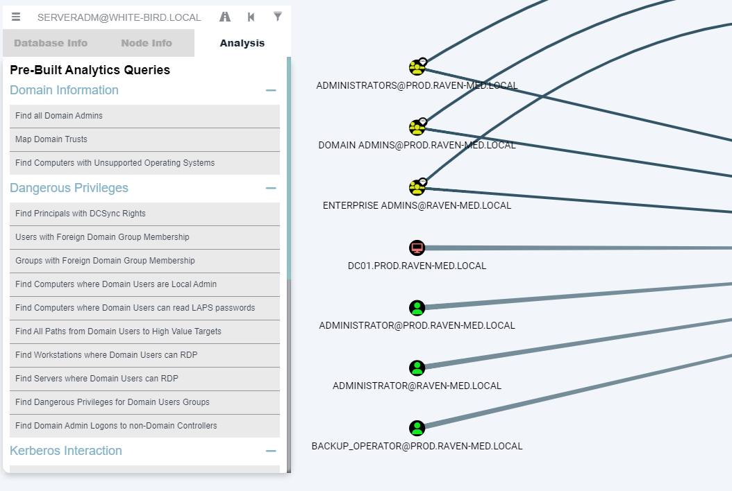 BloodHound 内置了一些好用的查询语句,例如帮助我们发现了用户 prod\back_operator 具有在 PROD 域内的 DCSync 特权。