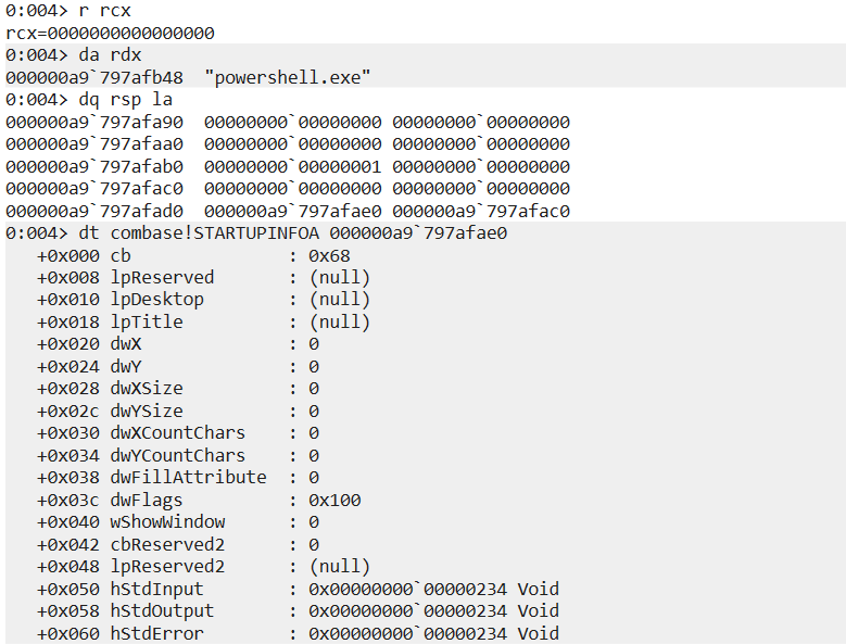 " mov rdx, rsp;" # 指向"powershell.exe"的指针保存在RCX寄存器中