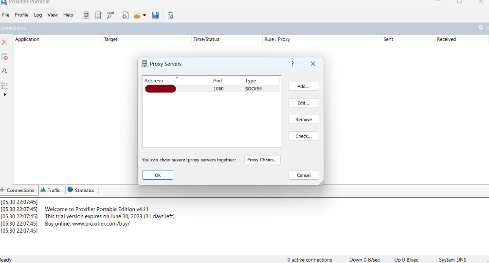 在 Windows 端,我们可以使用代理客户端例如 Proxifier (https://www.proxifier.com/) 来隧道应用的流量。打开 Proxifier,前往 Profile -> Proxy Servers,添加一个新的代理条目,将 IP 与端口指向团队服务器的 Socks 服务,即 <你们的VPS IP>:1080。