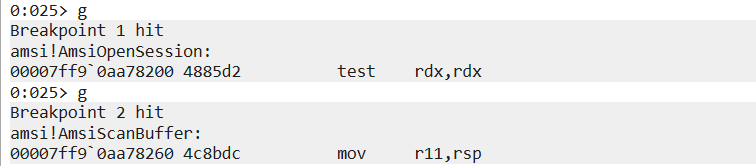 在继续 ETW 的话题之前,如果你们好奇为什么使用攻击 AmsiInitialize 或者 AmsiOpenSession 的载荷不管用,我们跑个题来分析一下。使用 WinDBG 给 PowerShell.exe 进程设置 4 个断点:
