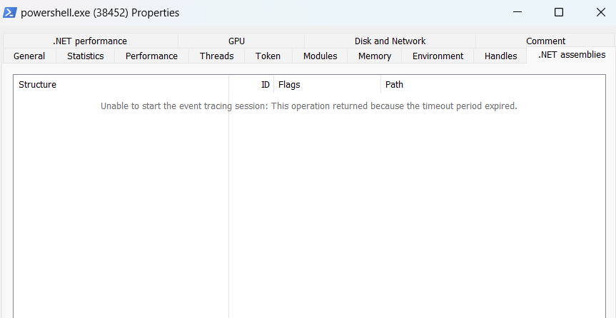 总之,绕过 AMSI 并将 Rubeus 加载到内存中之后,会有什么其他 IoC 呢?使用 ProcessHacker 查看当前的 PowerShell.exe 进程,我们发现 .NET assemblies 页面中能看到 Rubeus 的明文,这就是 ETW 直观的作用。